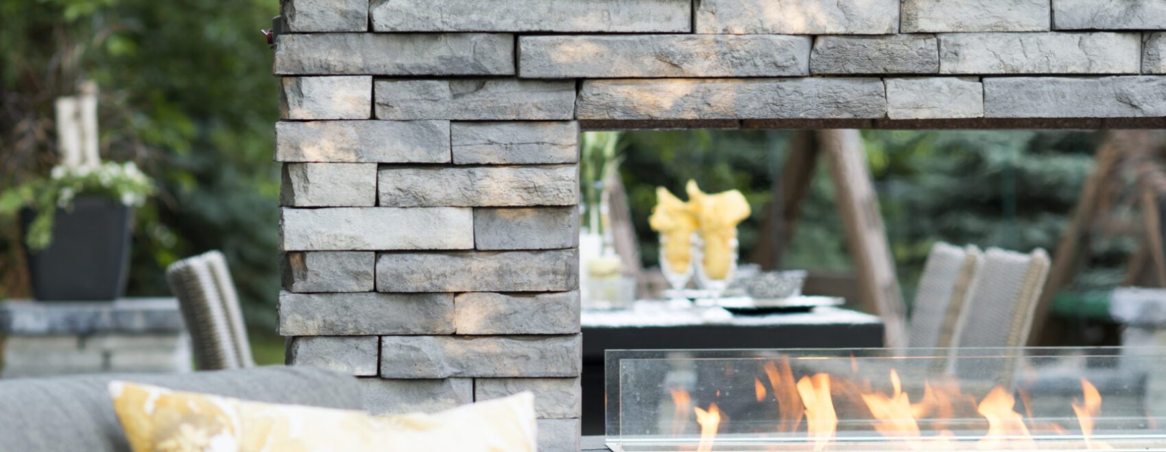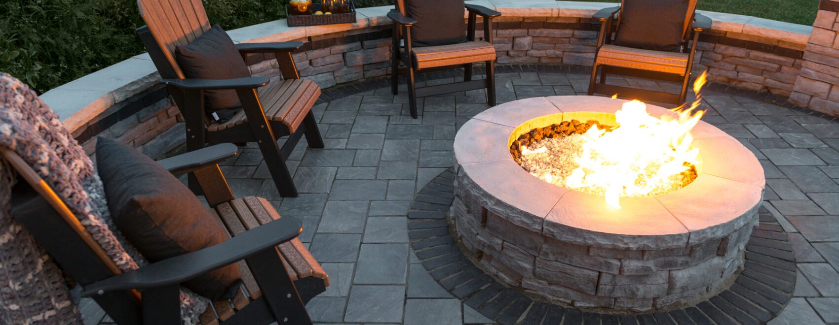 PAVER: Umbriano (Winter Marvel) with Umbriano (Midnight Sky) accent WALL: Lineo® Dimensional Stone (Limestone) with Lineo Dimensional Stone with Ledgestone (Grey) coping and pillar caps …