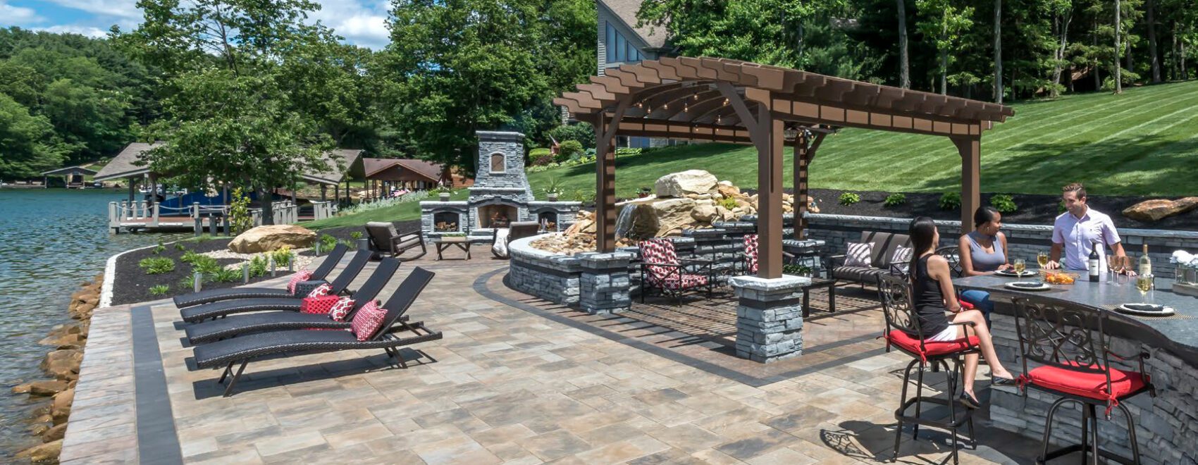 PAVER: Beacon Hill™ Flagstone (Sierra) with Umbriano® (Midnight Sky) accent and Beacon Hill™ Flagstone (Bavarian) pergola and fireplace areas with Umbriano (Midnight Sky) accent WALL, PILLARS, GRILL ISLAND AND FIREPLACE: Rivercrest® Wall (Coastal Slate) with Umbriano (Midnight Sky) …