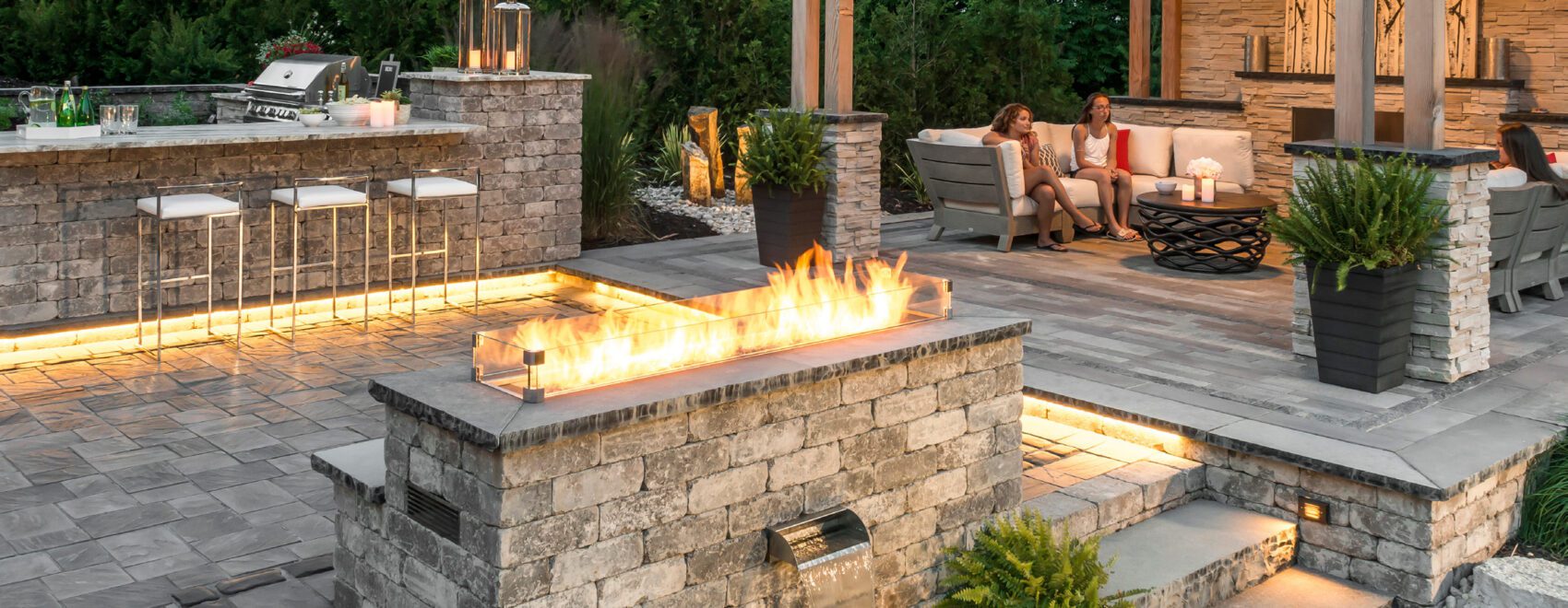 Unilock Richcliff & Courtstone Patio with Brussels Dimensional Grill Island, Wall & Water Feature