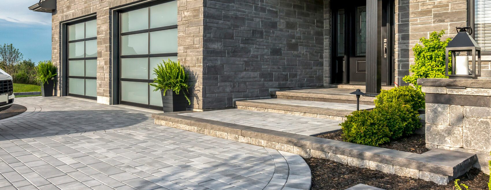 Unilock Artline Driveway with Brussels Dimension, Natural Stone & Ledgestone Porch