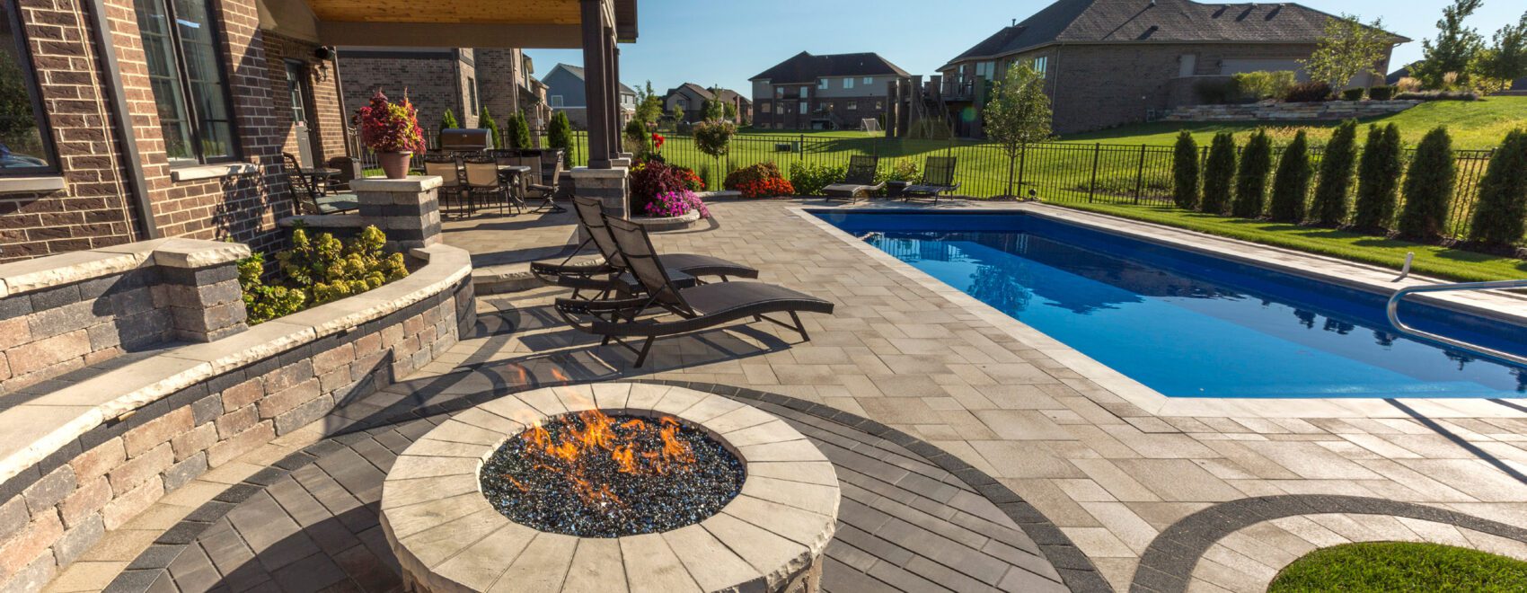 PAVER: Umbriano (Summer Wheat) with Series™ (Black Granite) accent and Artline™ (Steel Mountain) circle inset with Series (Black Granite) accent SEAT WALL, PILLARS AND FIREPIT: Brussels Dimensional System™ (Sierra) with Series (Black Granite) accent and Ledgestone (Buff) …