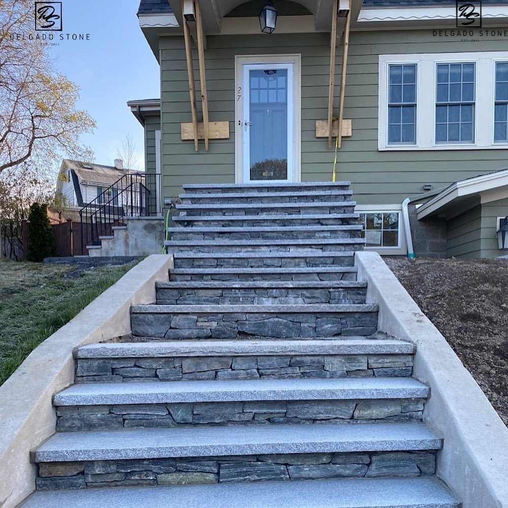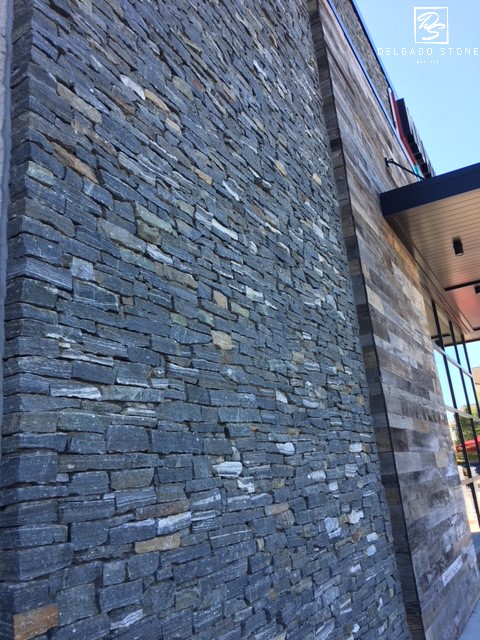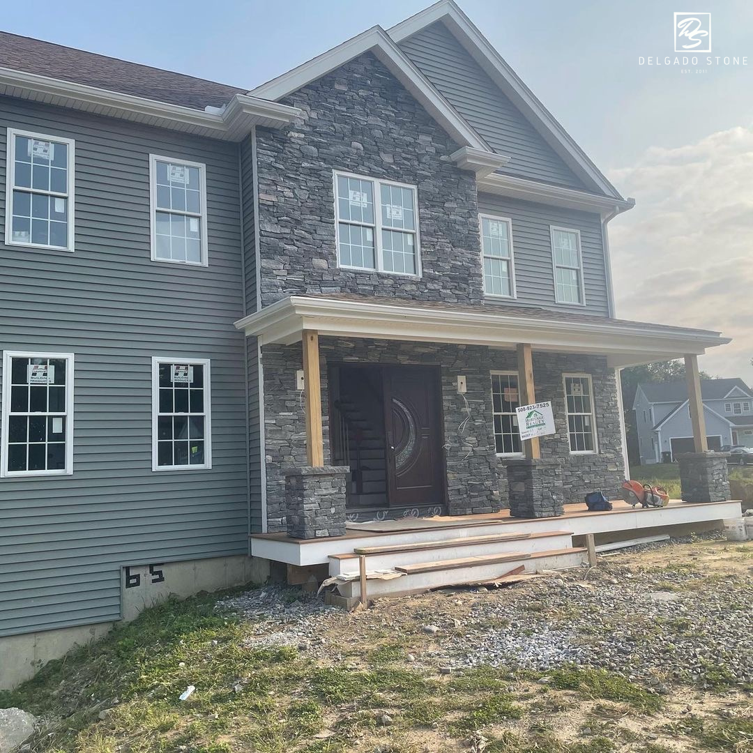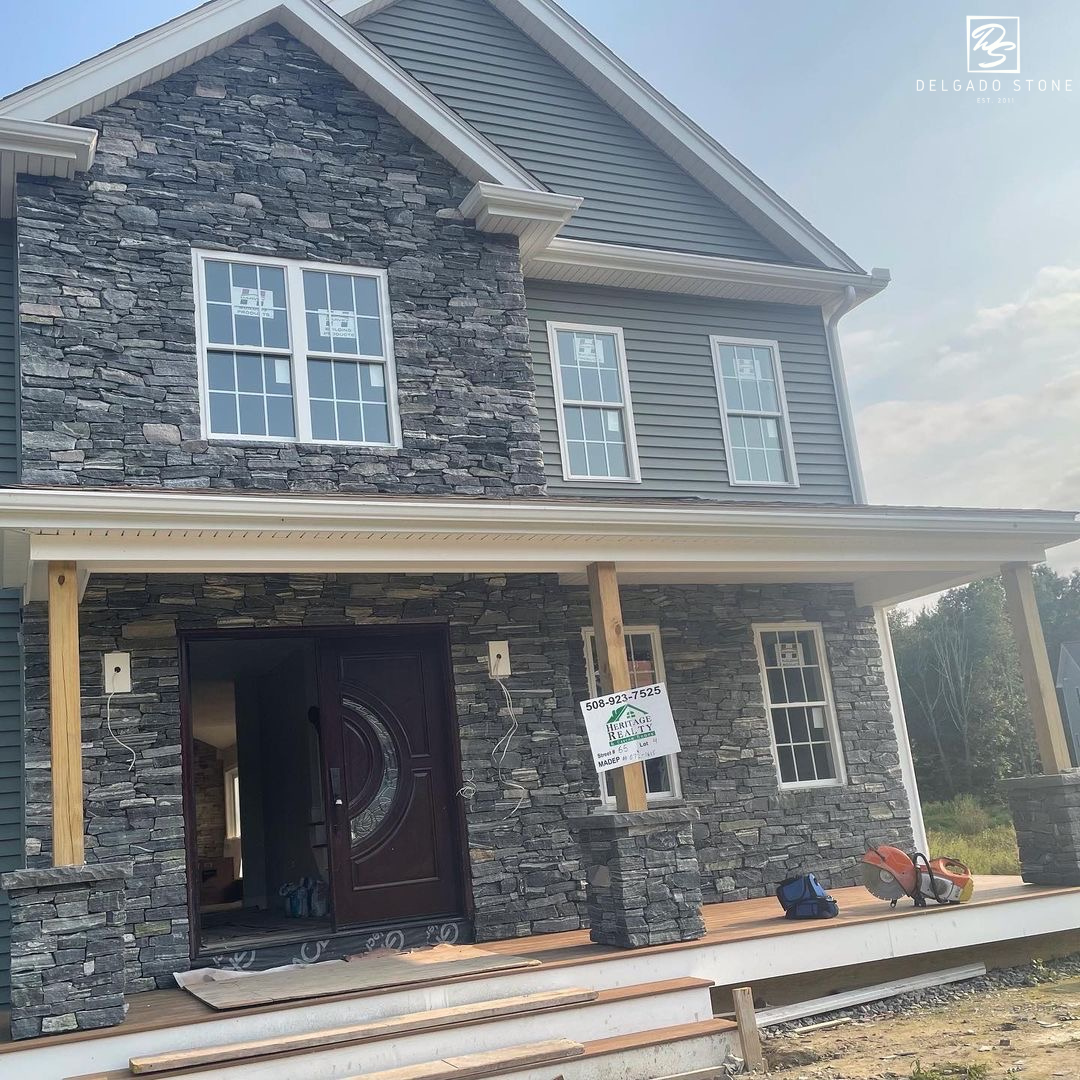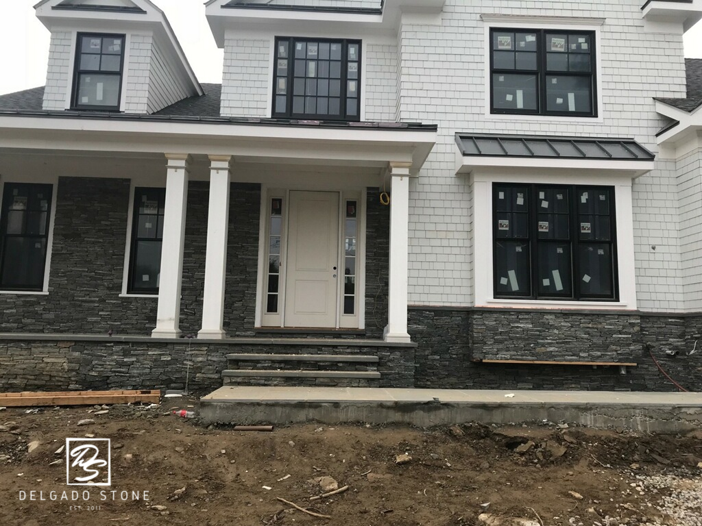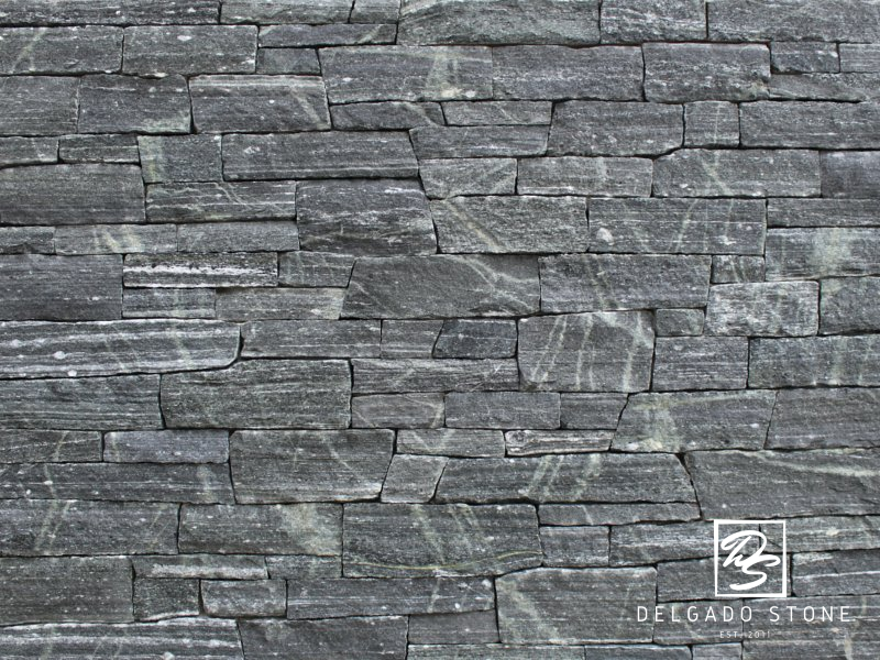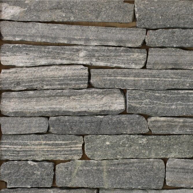 Delgado Stone American Mist Ledge veneer features a tightly stacked linear profile that enhances the natural texture of this dark grey stone, highlighted with subtle white, tan, and green accents. Designed for clean, horizontal masonry lines, this ledge cut brings depth and dimension to Long Island projects ranging from sleek contemporary builds to rustic, castle-inspired designs. Its versatility and strong visual impact make it a standout choice for both indoor and outdoor applications.