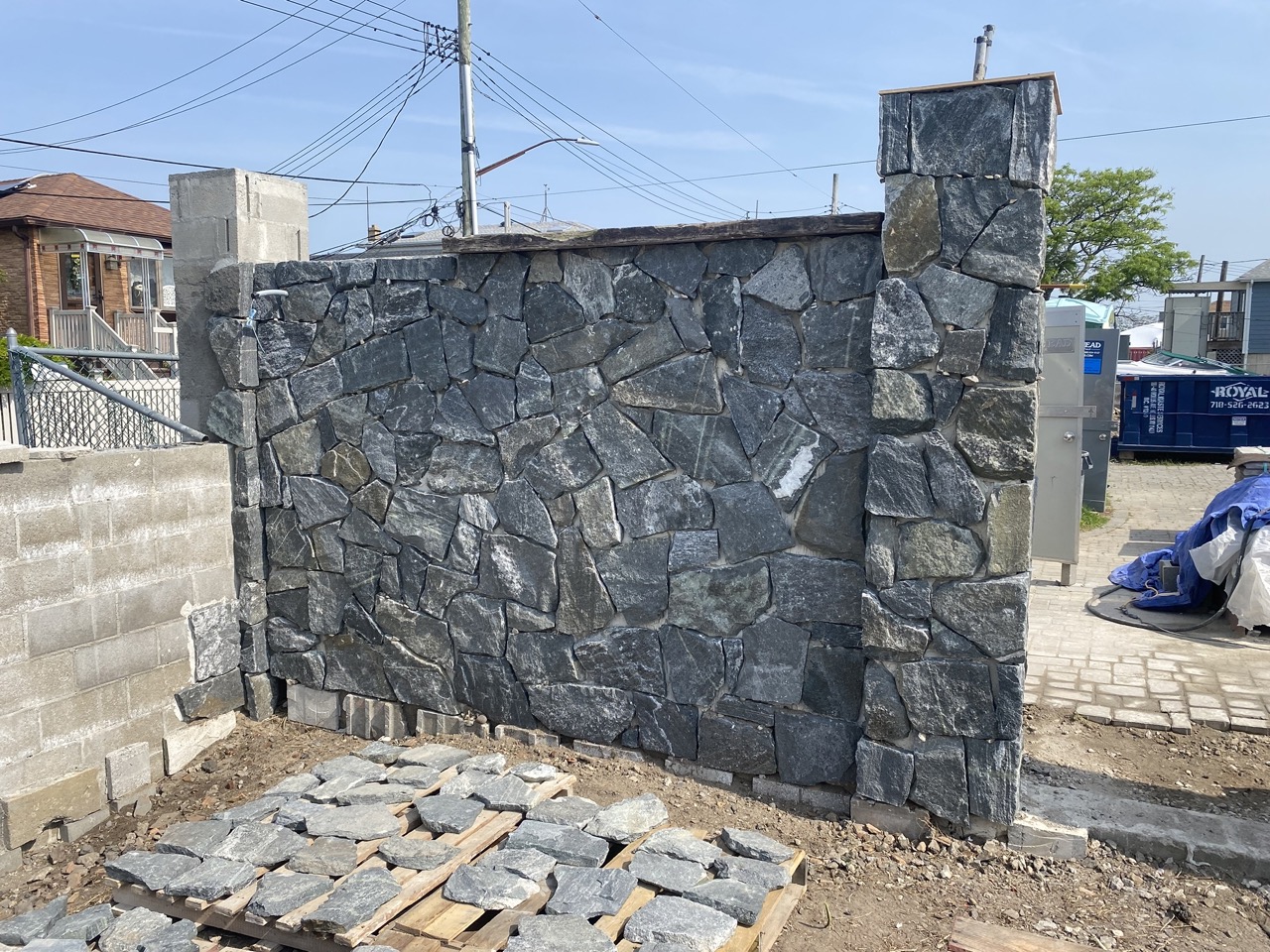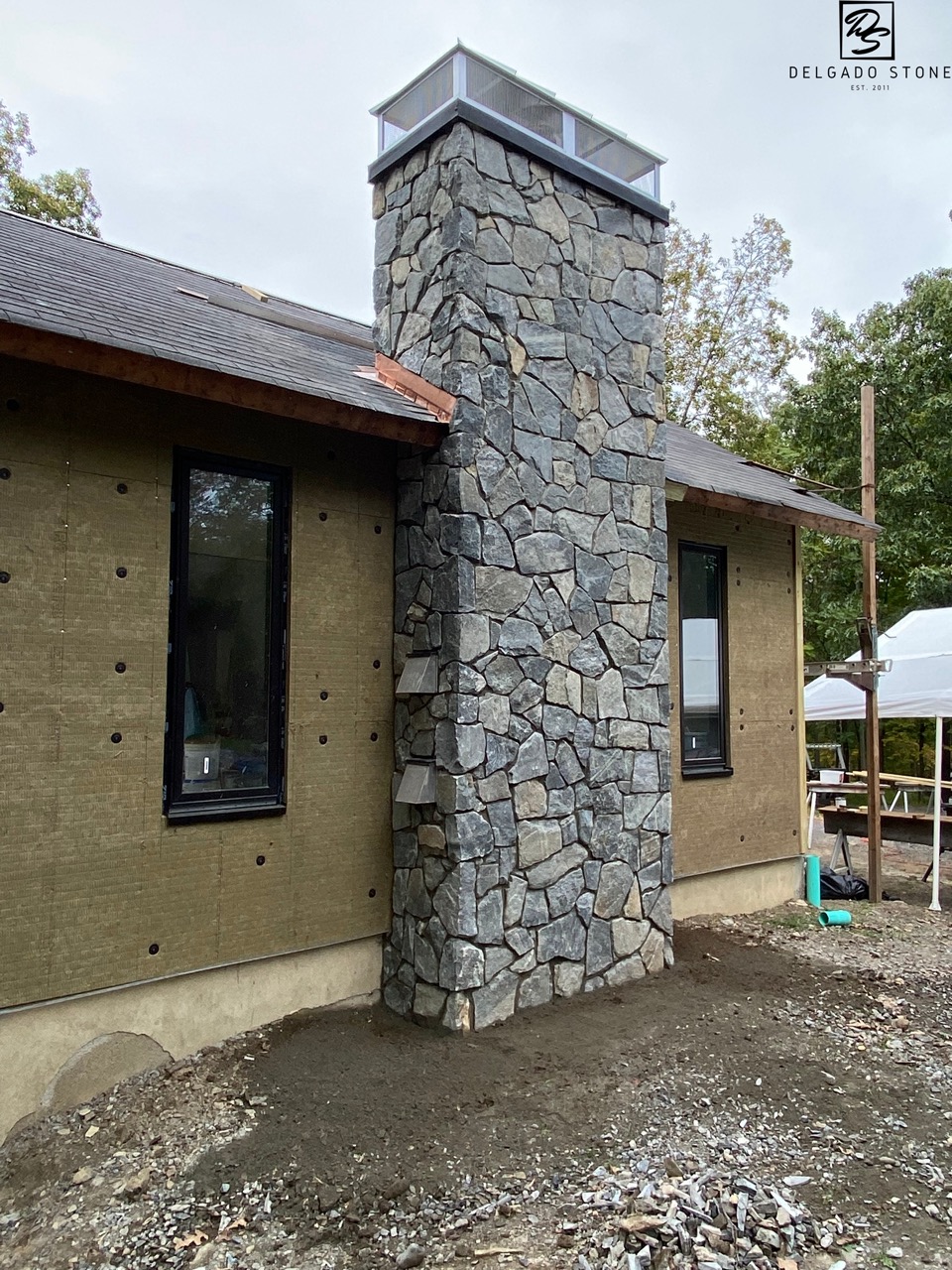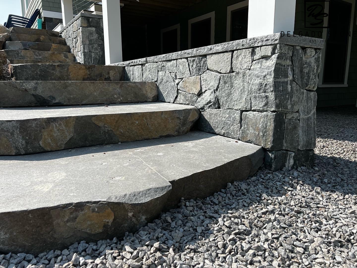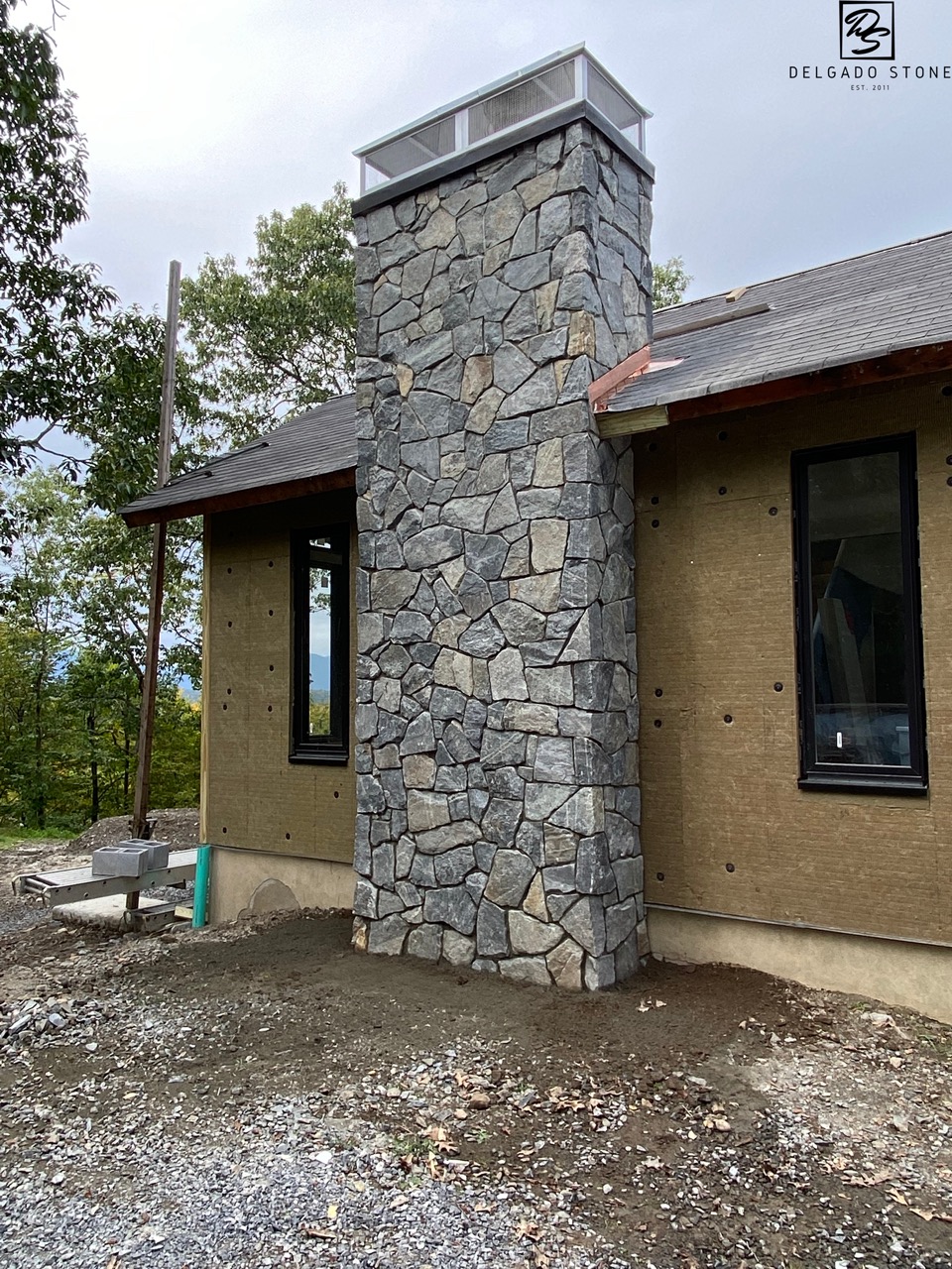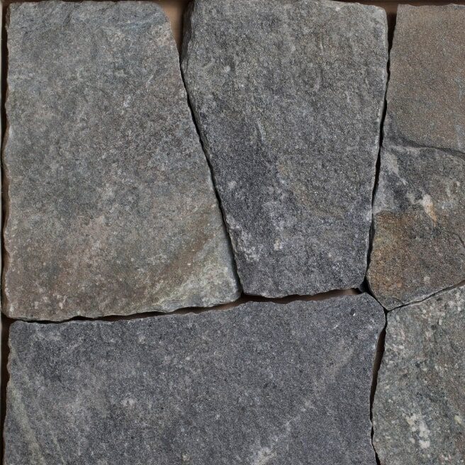 Delgado Stone American Mist Mosaic veneer features a bold dark grey base complemented by subtle touches of white, tan, and green, offering a rich visual texture for masonry designs. The irregular mosaic pattern brings organic movement and depth, making it a versatile choice for everything from modern architecture to old-world-inspired builds across Long Island. Crafted from natural stone, American Mist delivers timeless appeal and adaptability for interior and exterior walls, fireplaces, and landscape elements.