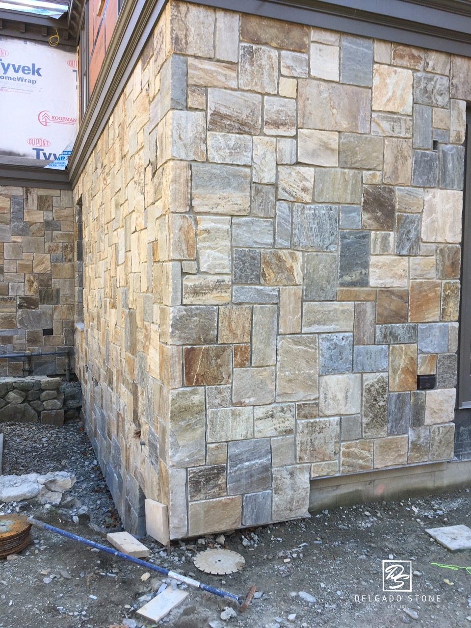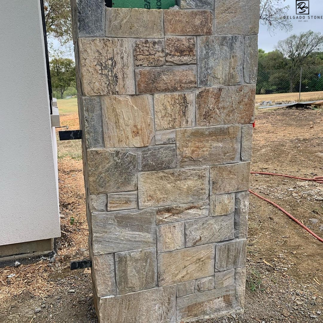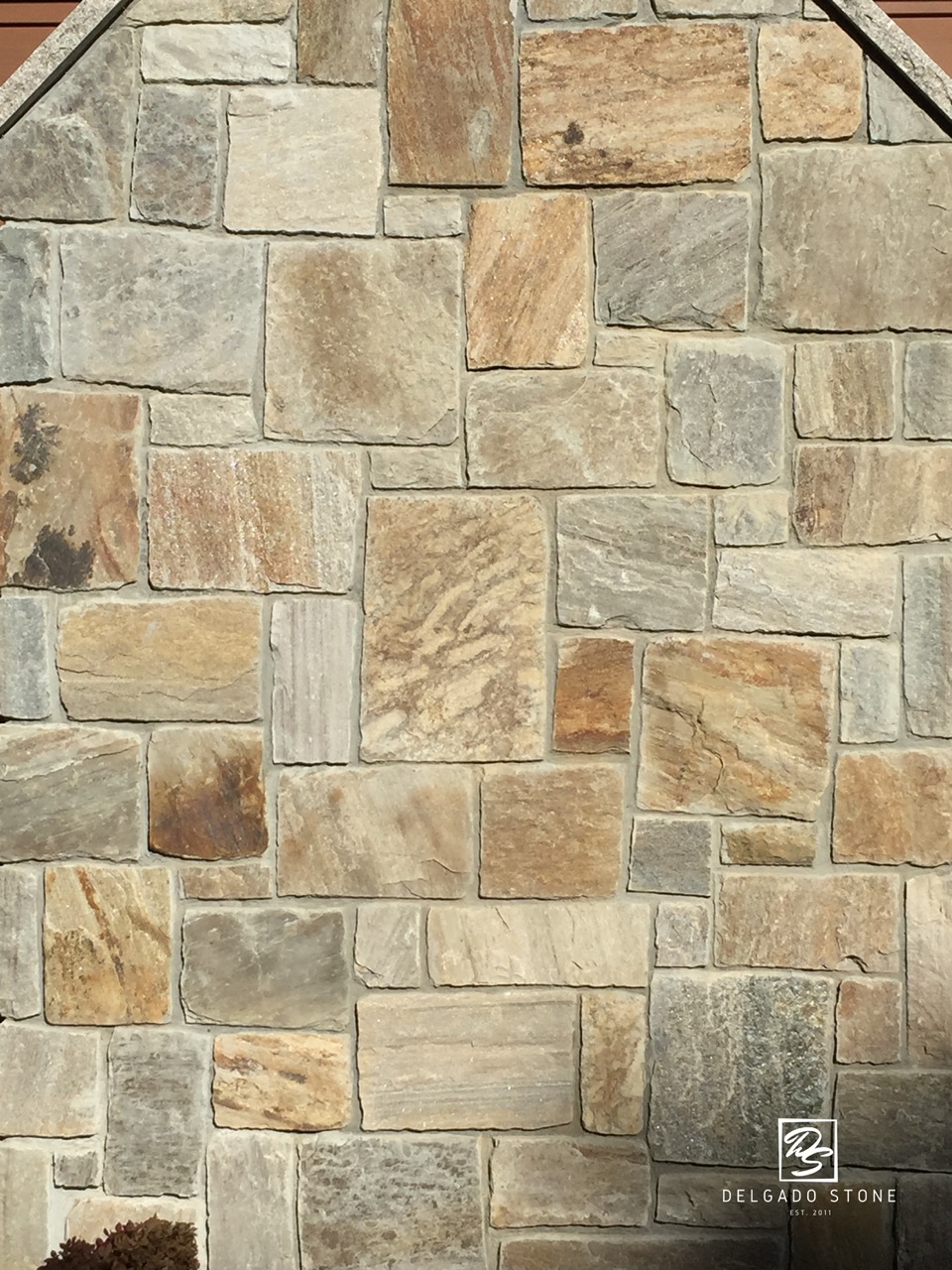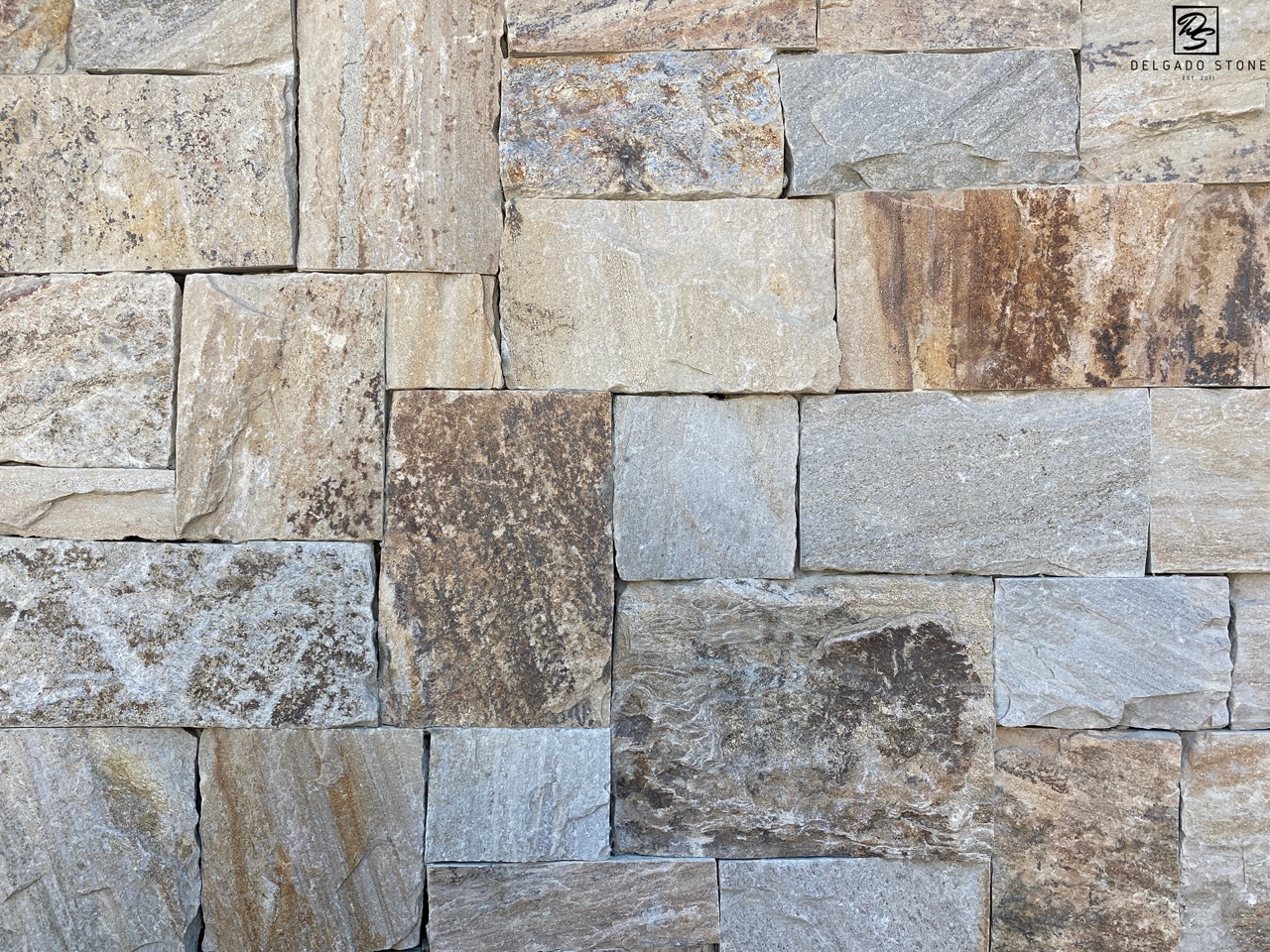 Delgado Stone Sterling Tan Square and Rectangle veneer blends geometric balance with the textured appeal of native quartzite, offering a structured layout that suits traditional and transitional masonry styles. A reliable choice for Long Island installations aiming for clean lines without sacrificing stone character.
